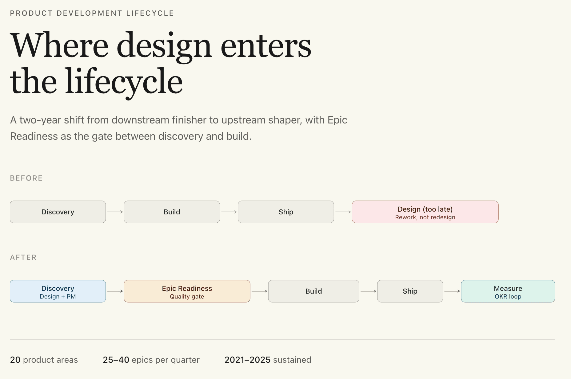 Embedded design into the product development lifecycle across 20 product areas and 25-40 epics per quarter, shifting design's role from downstream finisher to upstream shaper