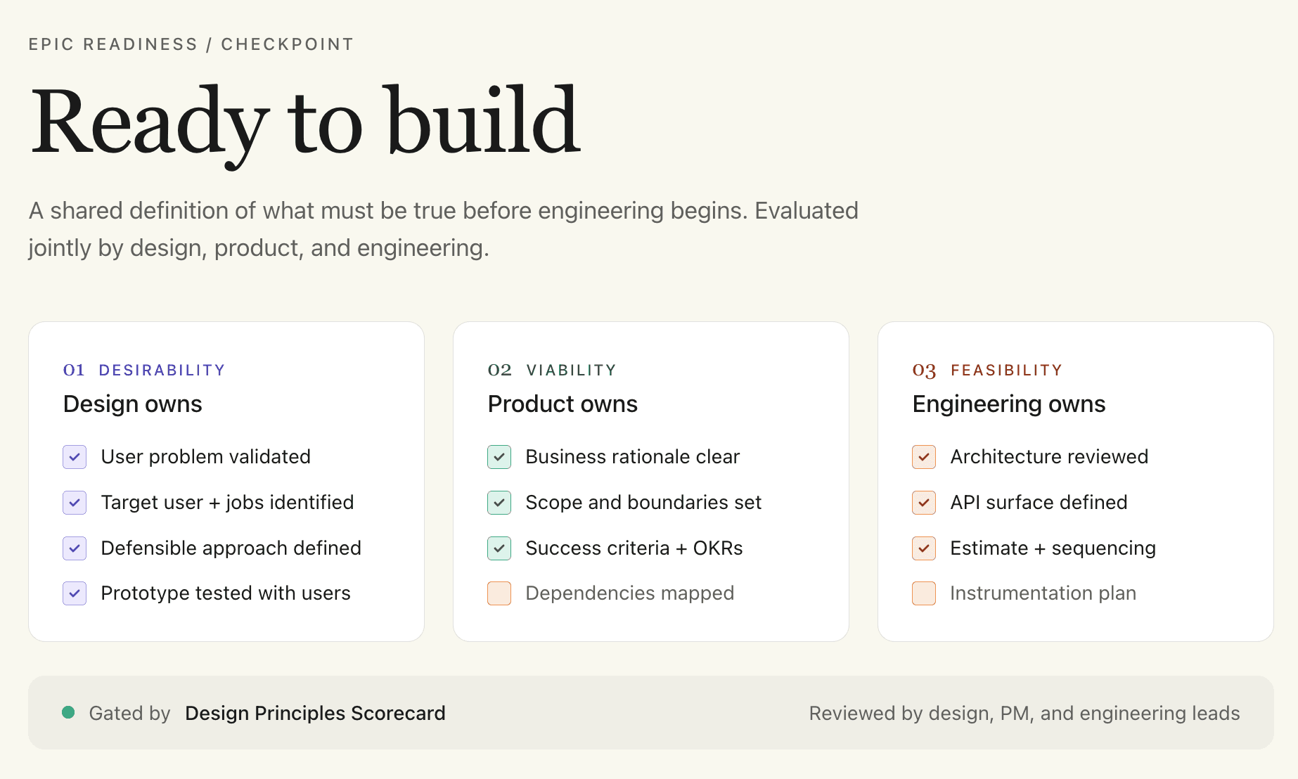 The core artifact I built was an Epic Readiness ritual, a checkpoint requiring validated discovery and design work before engineering could start. I worked backwards from what engineering needed as inputs, then defined what design and product management had to produce to get there. Design was responsible for desirability: do we understand the problem, the user, and a defensible approach to solving it? Product management was responsible for viability: do we understand what we're building and why?